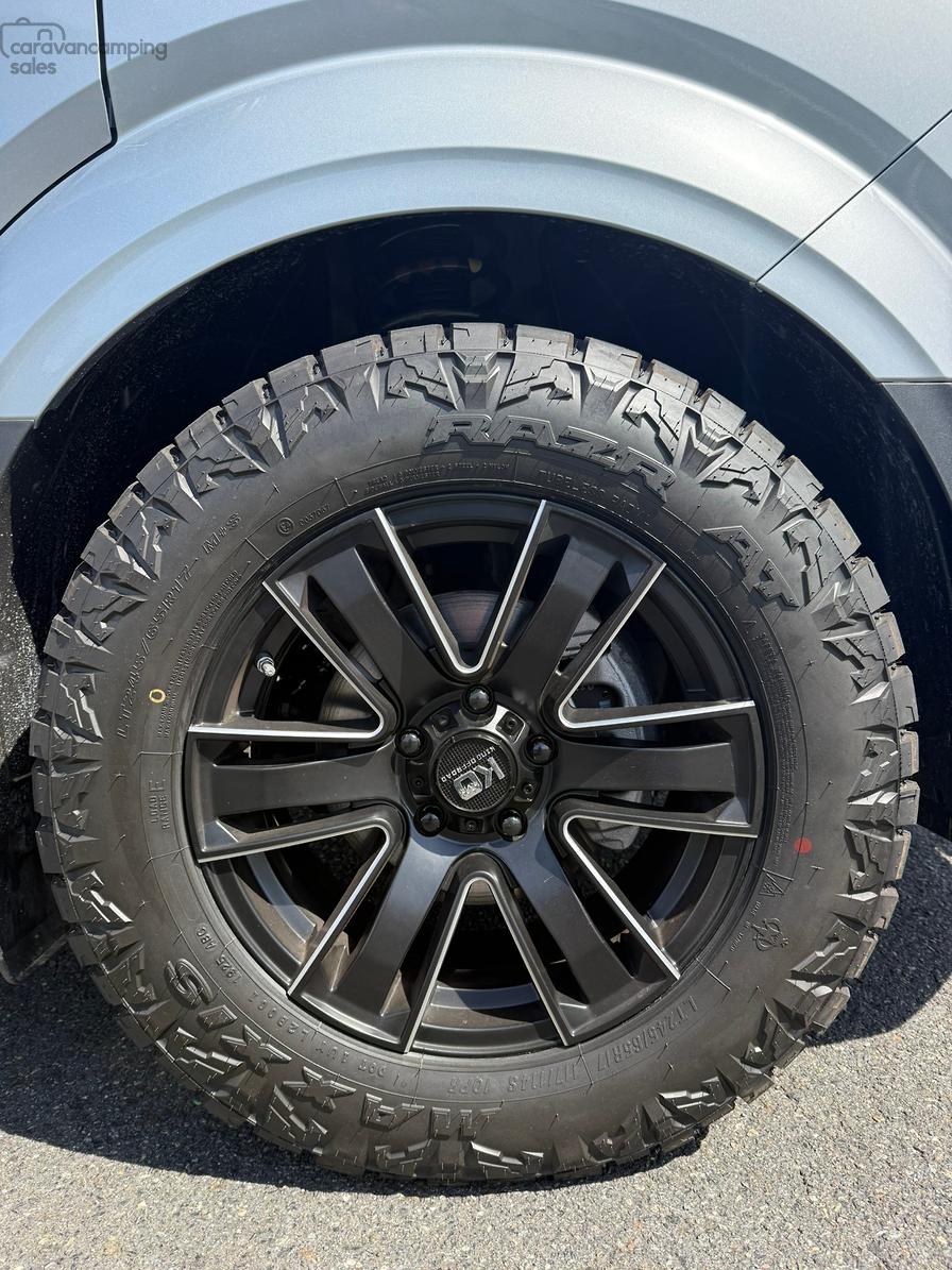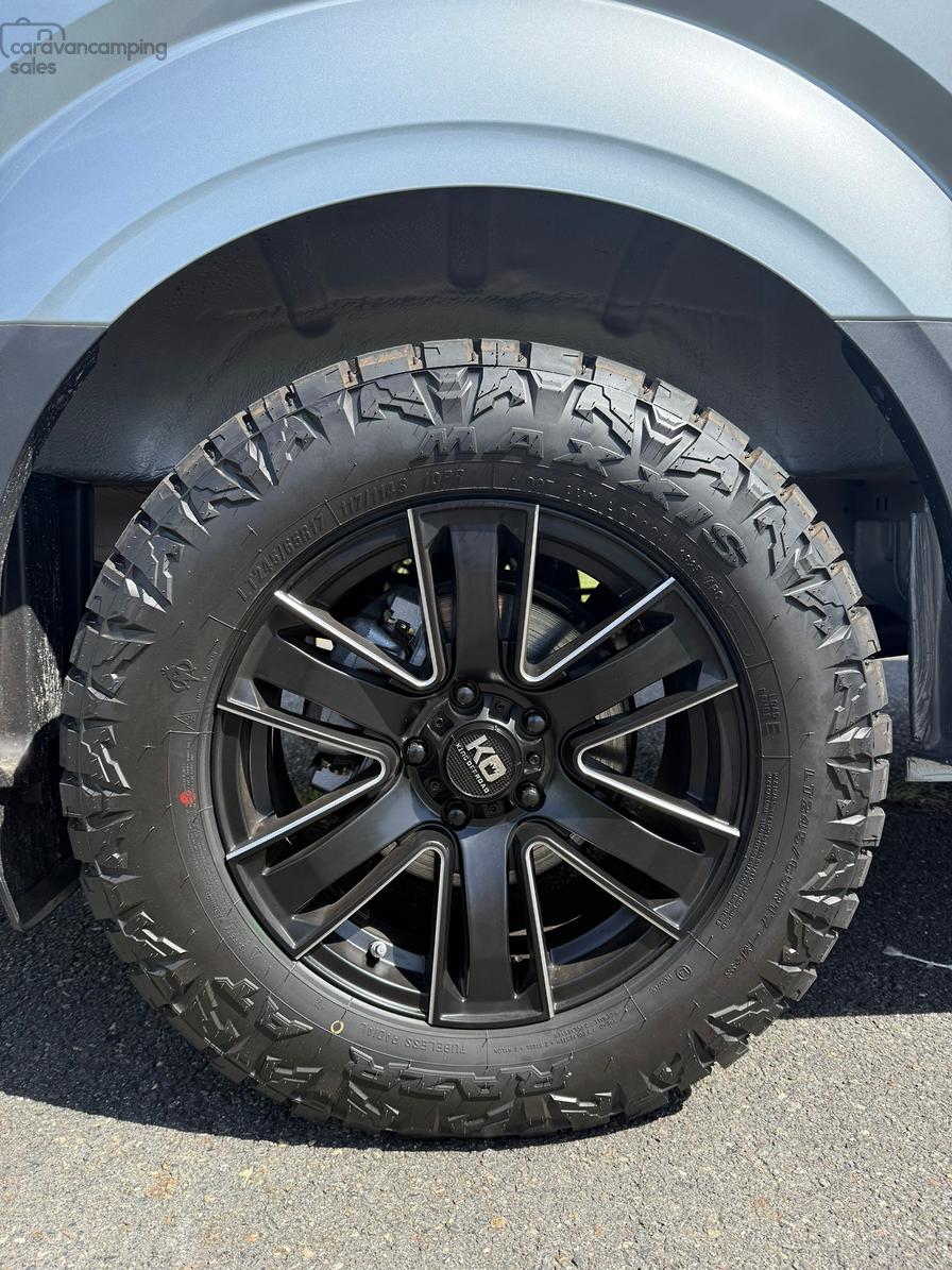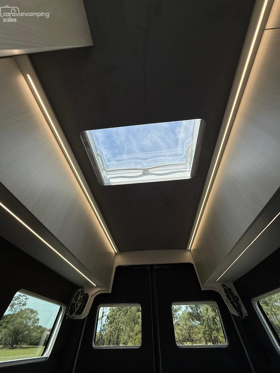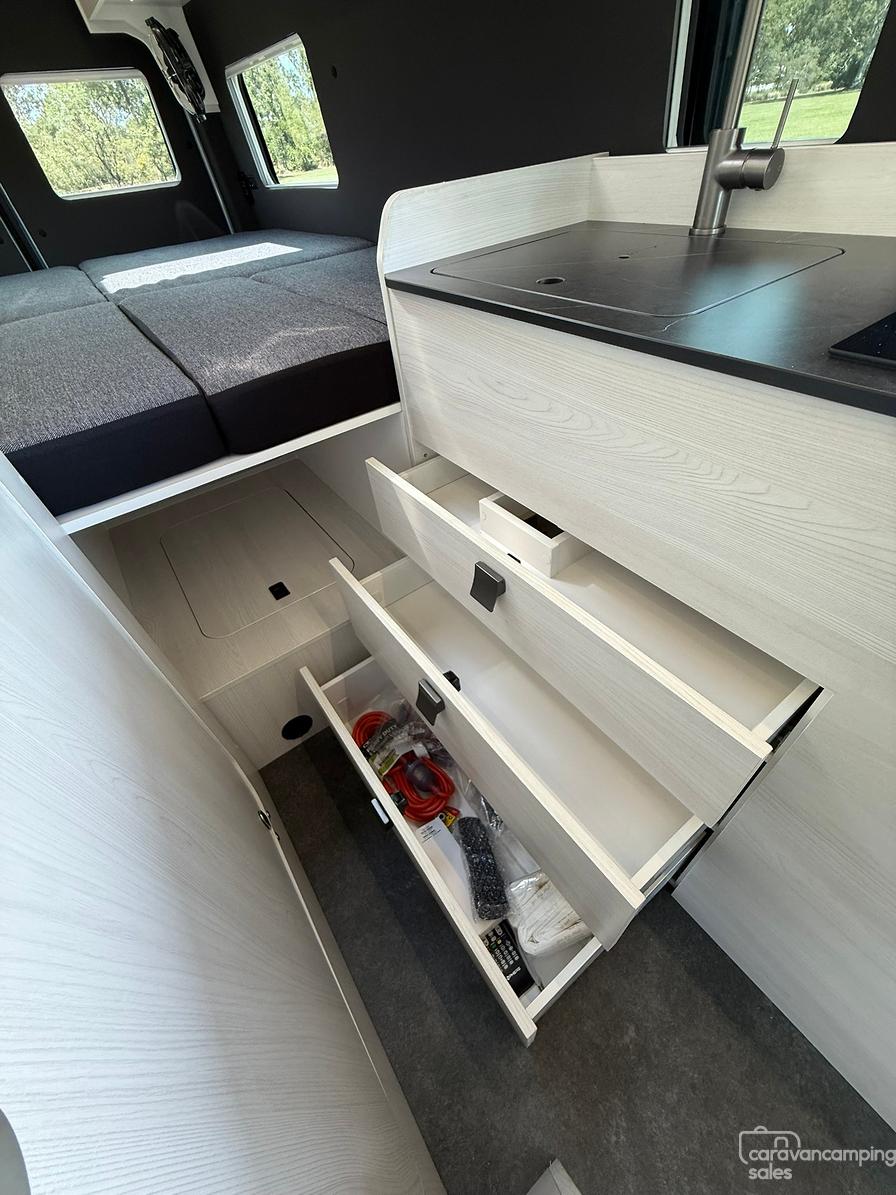 Specification highlights include the largest bed in its class at 1.9×1.7m, an off grid battery/solar system system more than capable to power dual cycle AC and induction cooking while on the go and a huge water carrying capacity for both fresh and grey water
