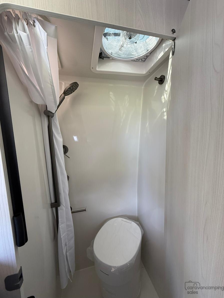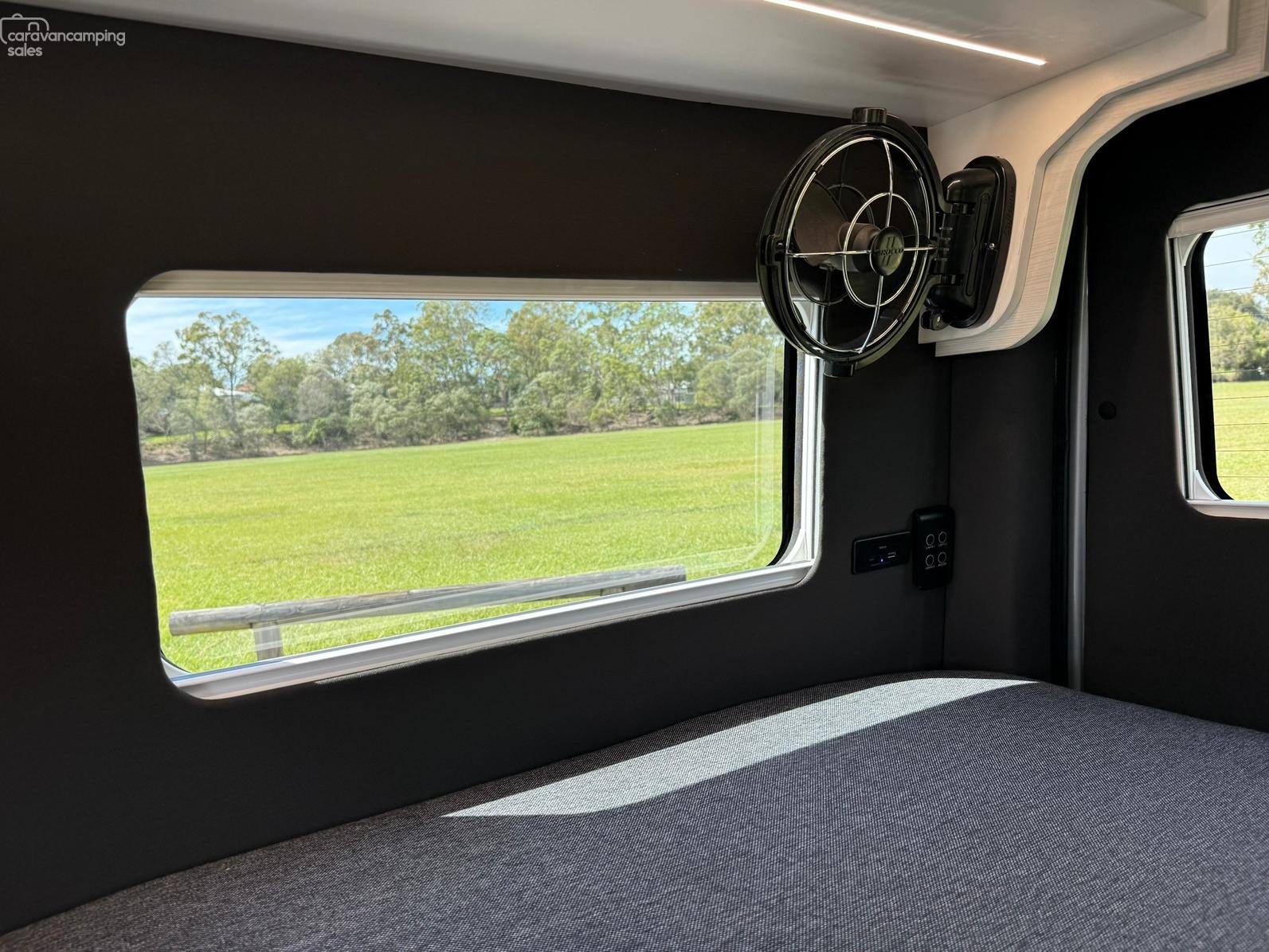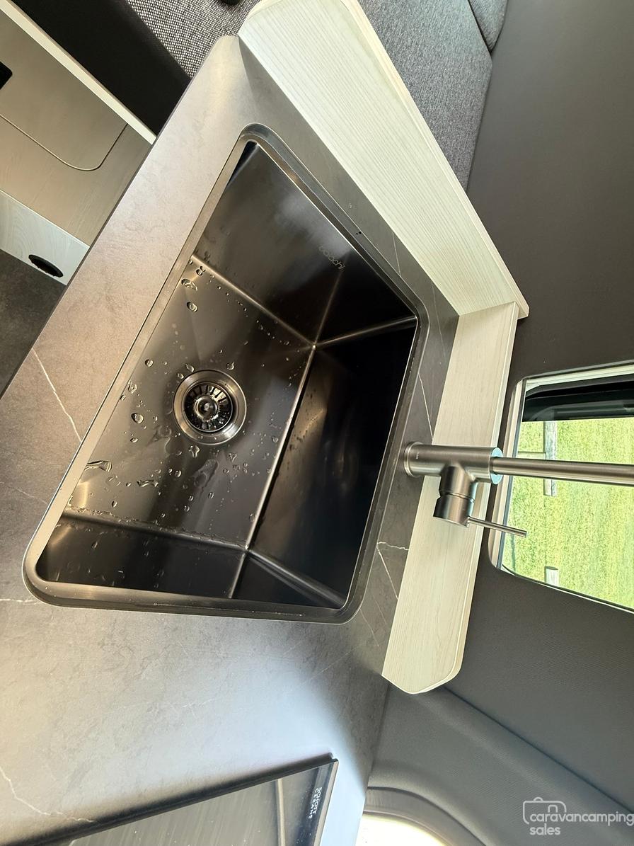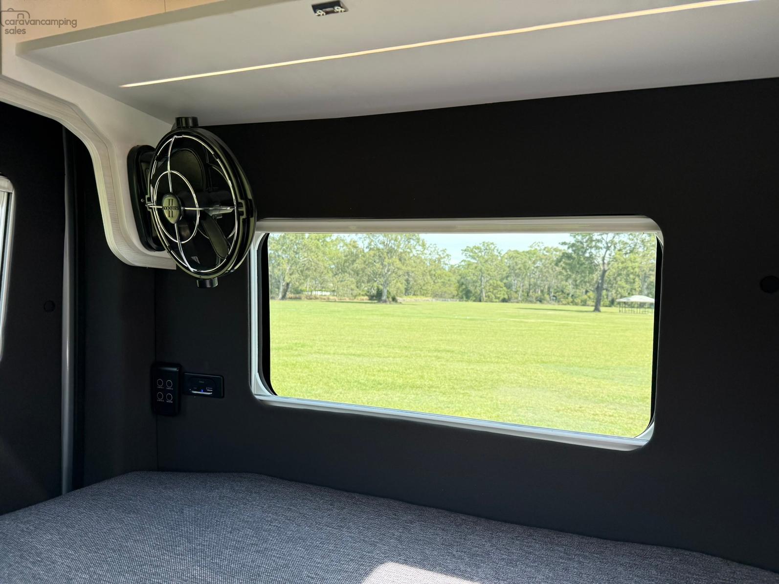 Specification highlights include the largest bed in its class at 1.9×1.7m, an off grid battery/solar system system more than capable to power dual cycle AC and induction cooking while on the go and a huge water carrying capacity for both fresh and grey water